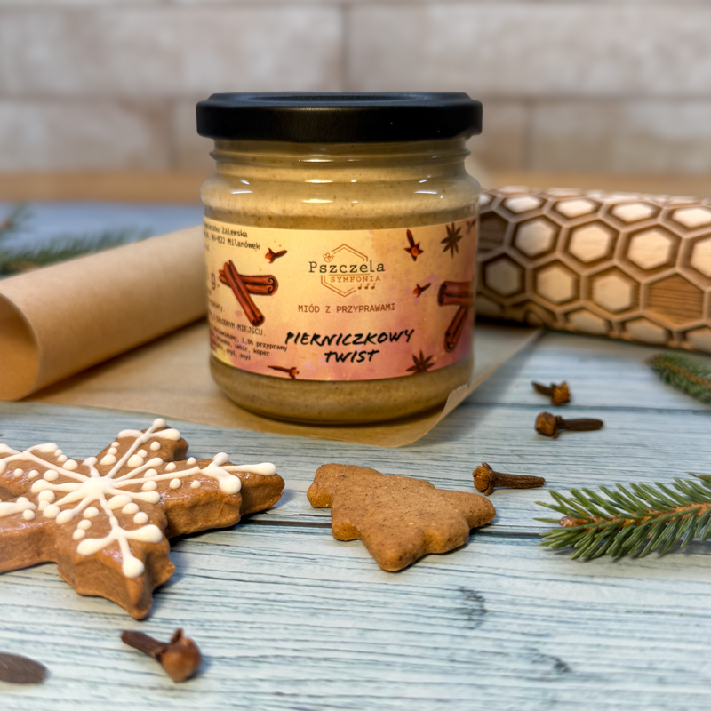 Miód z przyprawami „Pierniczkowy Twist” to wyjątkowy produkt, który łączy naturalną słodycz prawdziwego miodu z głębokim aromatem przypraw korzennych. Jeśli szukasz miodu idealnego na zimowe wieczory, świąteczne wypieki lub codzienne chwile relaksu, ten korzenny miód będzie strzałem w dziesiątkę. To smak, który od pierwszej łyżeczki przywołuje klimat pieczonych pierniczków, ciepła domowej kuchni i pachnących świąt.