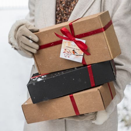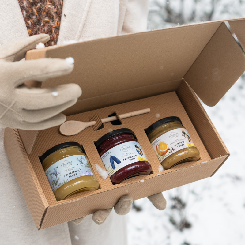 Zestaw trzech miodów z naszej pasieki zapakowany w eleganckie pudełko z tektury falistej.