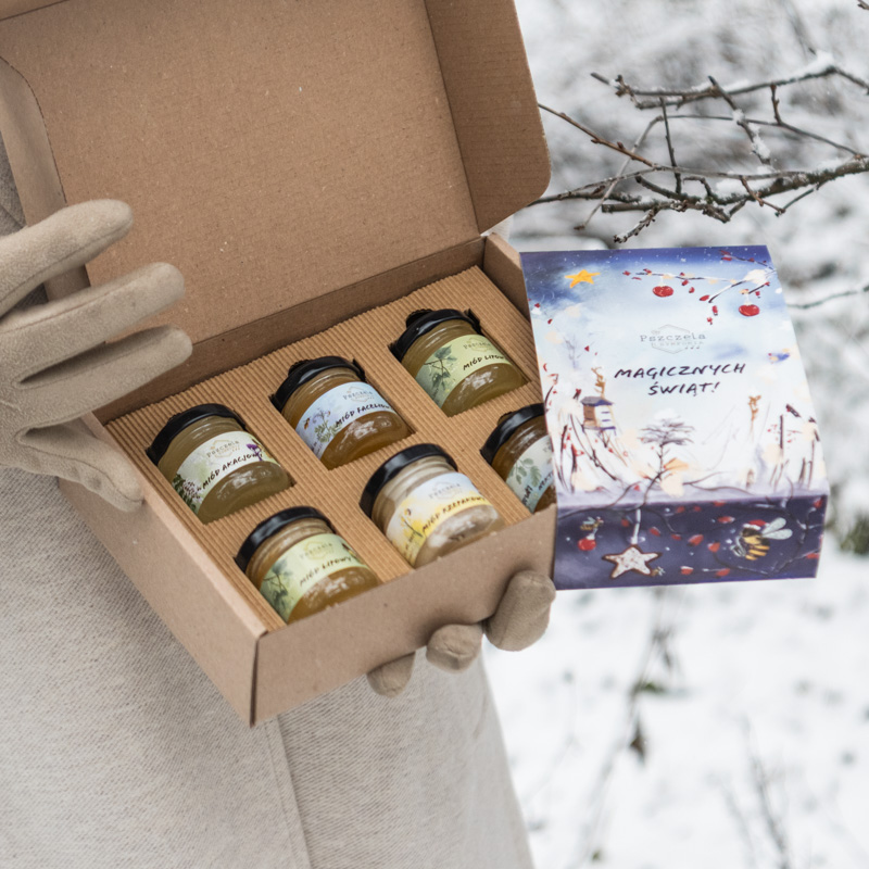 Przedstawiamy zestaw sześciu mini-miodków z naszej pasieki w przepięknej oprawie Świątecznej.